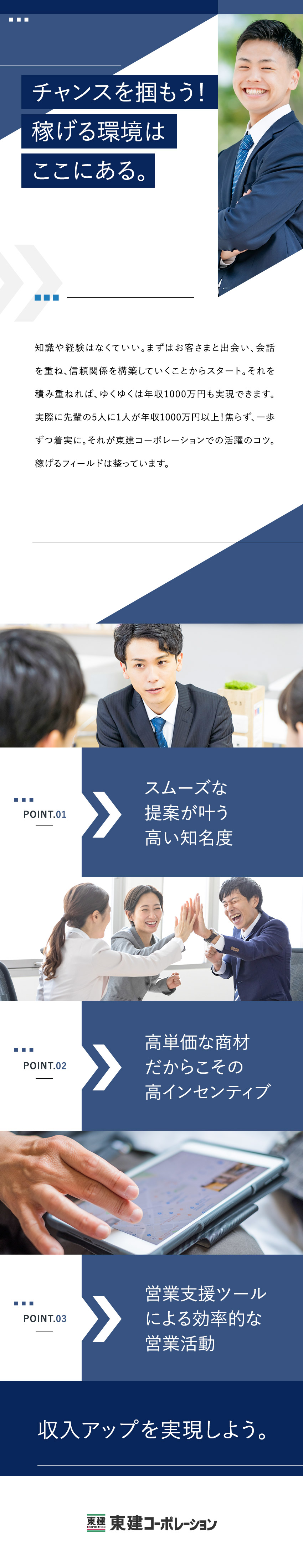 平均年収も高く、年収1000万円を超えている社員も多い。そんな裏側には地道な営業活動や日々の努力があります。入社してすぐに契約を取れるということは難しく、お客さまと関係を深め、地道な営業活動が大事な仕事です。