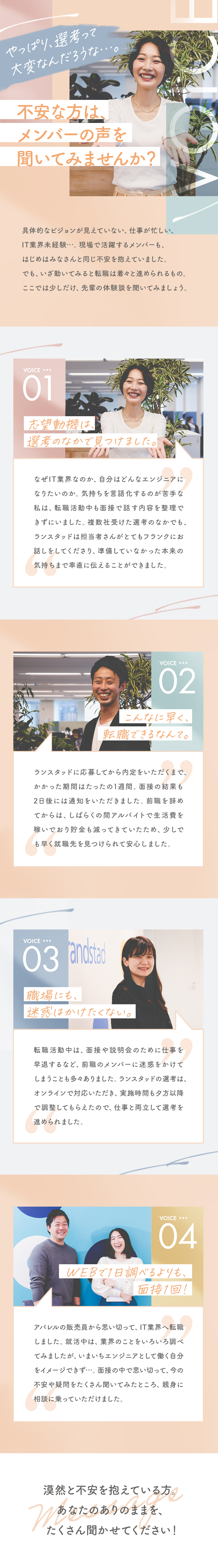 IT業界に興味はありましたが、知識や経験が必須で敷居が高いイメージでした。でも、ランスタッドでは研修が整っていて「自分でも頑張れそう!」と感じ入社を決意しました。