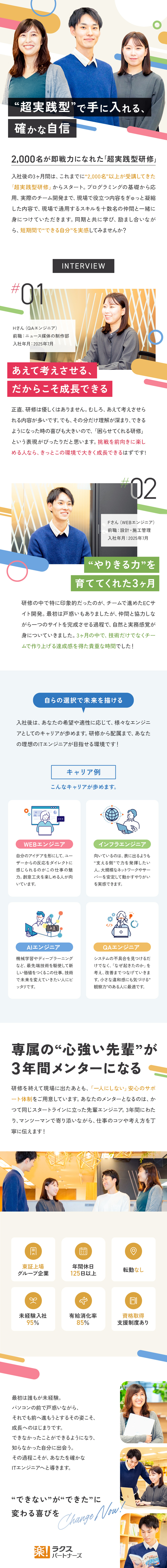 未経験から「本気で成長できる環境」がラクスパートナーズの一番の魅力。もともとITスクール運営にルーツを持つため、実践型の研修プログラムが非常に充実しており、同期の仲間と共に切磋琢磨しながらスキルアップを図れます。研修後もブラザー&シスター制度で先輩エンジニアが親身にフォロー。異業種からIT業界へチャレンジしたい方にはぴったりの環境で、実際に元販売職や事務職など、多様な前職を持つメンバーが活躍中です。