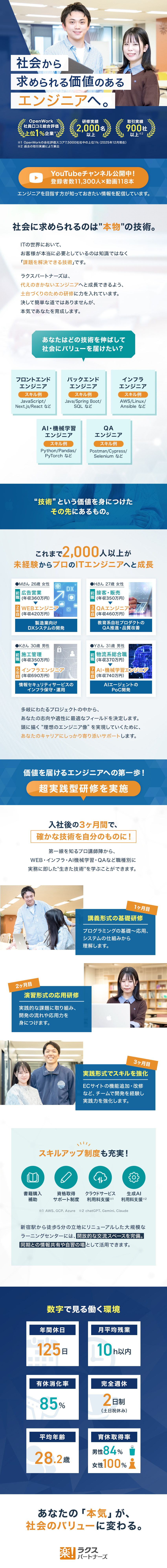 未経験から「本気で成長できる環境」がラクスパートナーズの一番の魅力。もともとITスクール運営にルーツを持つため、実践型の研修プログラムが非常に充実しており、同期の仲間と共に切磋琢磨しながらスキルアップを図れます。研修後もブラザー&シスター制度で先輩エンジニアが親身にフォロー。異業種からIT業界へチャレンジしたい方にはぴったりの環境で、実際に元販売職や事務職など、多様な前職を持つメンバーが活躍中です。
