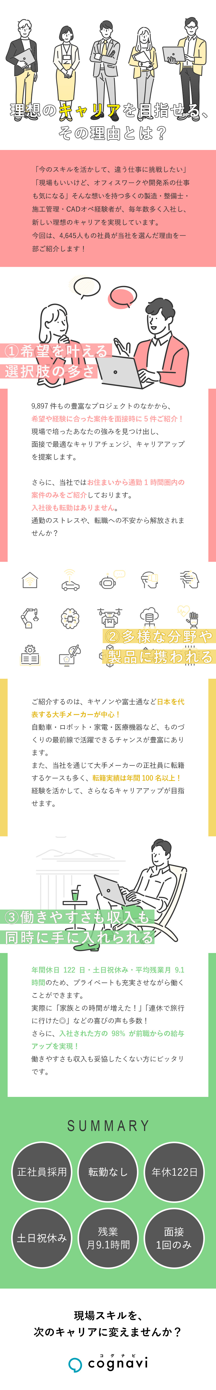 前職経験を活かして給与アップしたいと思い、応募しました。現在は希望通り大手メーカーで自動車内装部品の設計の仕事をしています。給与アップとスキルアップ、両方叶えることができて満足しています。