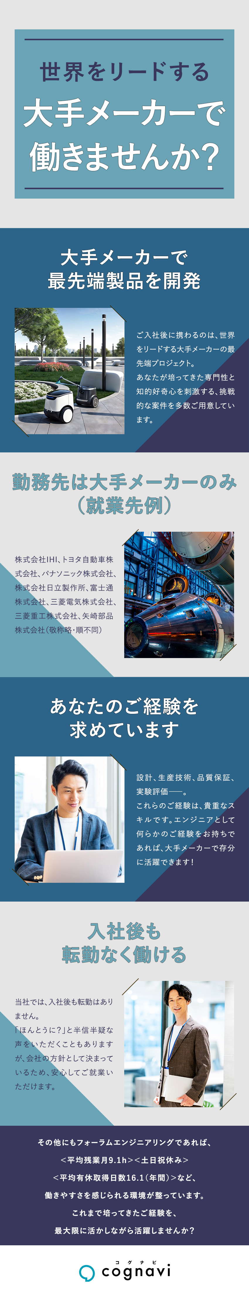 ★トヨタ自動車株式会社、株式会社IHI、株式会社日立製作所、富士通株式会社、パナソニック株式会社など、大手メーカーのプロジェクト多数!あなたに最適なフィールドをご提案させていただきます。