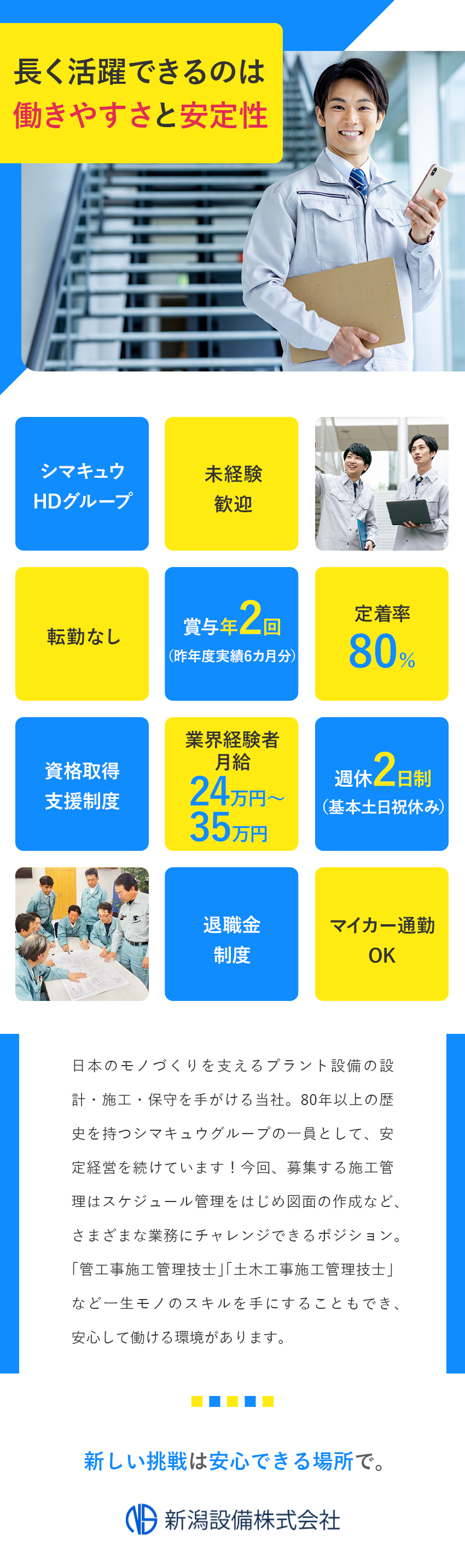 プラント設備施工管理/賞与実績6カ月分/社員定着率80%以上