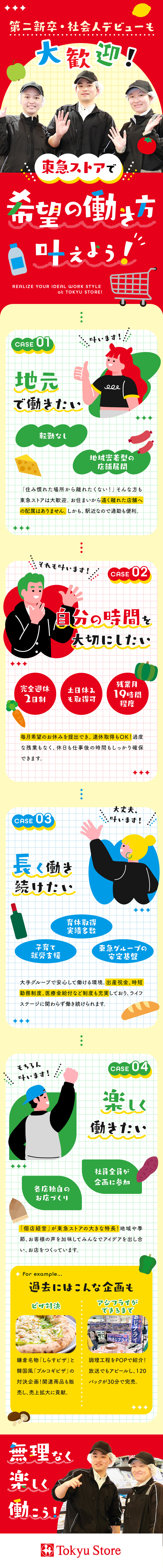 鉄道、不動産、スーパーなど多彩な事業を展開する東急グループ。なかでも東急ストアは東急線沿線を中心とした店舗展開で、地域に密着したスーパーとして業績を伸ばしています。安定企業ならではの福利厚生の手厚さなど、バランスよく働ける環境は大きな魅力の一つです。