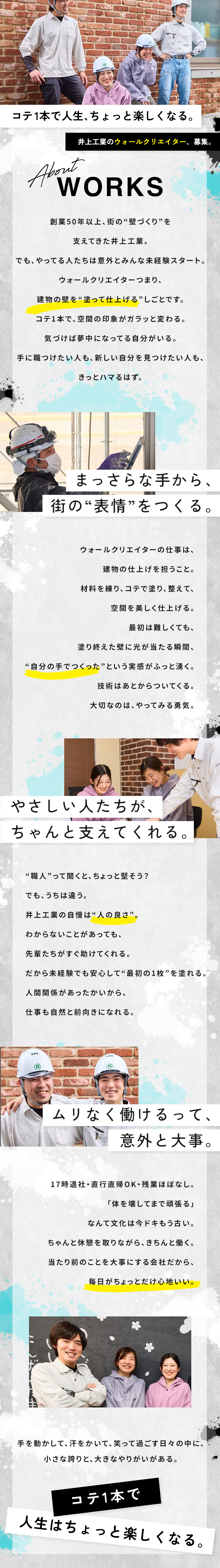 井上工業のウォールクリエイターたちは、技術だけじゃなく“自分の人生”も丁寧に仕上げている人たち。壁を塗るたび、心まで晴れていくような明るさがあって、“働くって悪くないかも”と思わせてくれる。手でつくって、笑って、ちゃんと誇れる。そんな毎日が、ここにはありました。