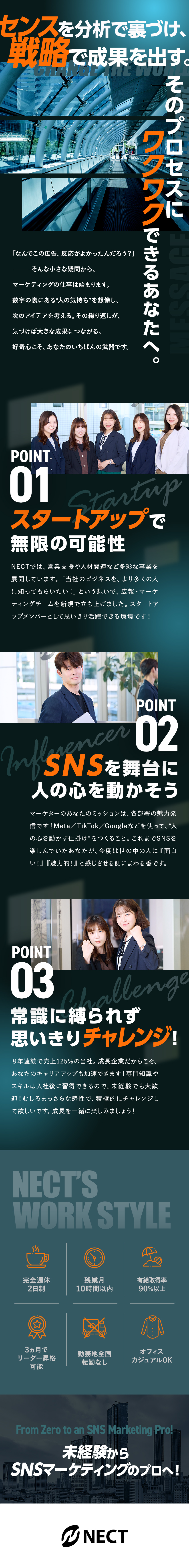 「これからやりたいことを見つけたい!」という方も大歓迎です。ぜひNECTで目標や楽しいと思える仕事を見つけてください。新たな一歩を踏み出す方を私たちは全力で応援します!