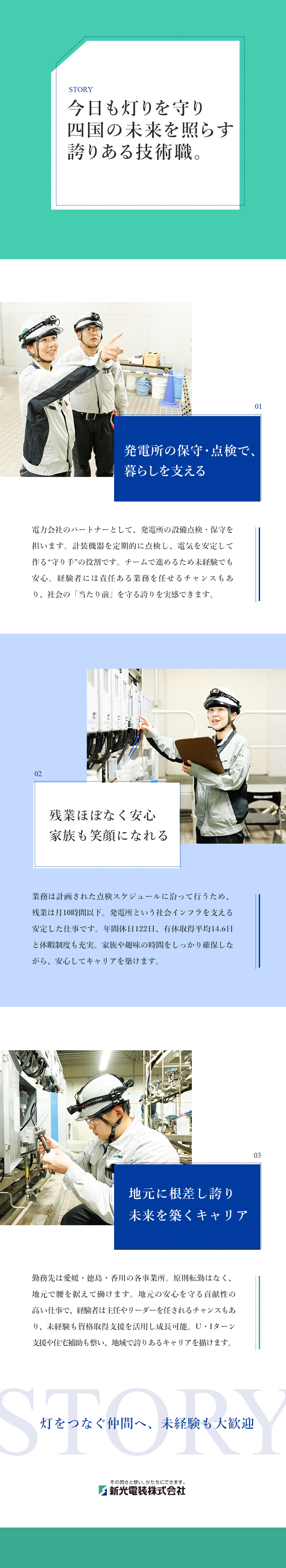 電力会社のパートナー企業として、創業から50年に渡り電力の安定供給を担ってきた新光電装。取材を通して感じたのは、地域に欠かせないインフラを守る責任と、社員一人ひとりが誇りを胸に働いている姿でした。