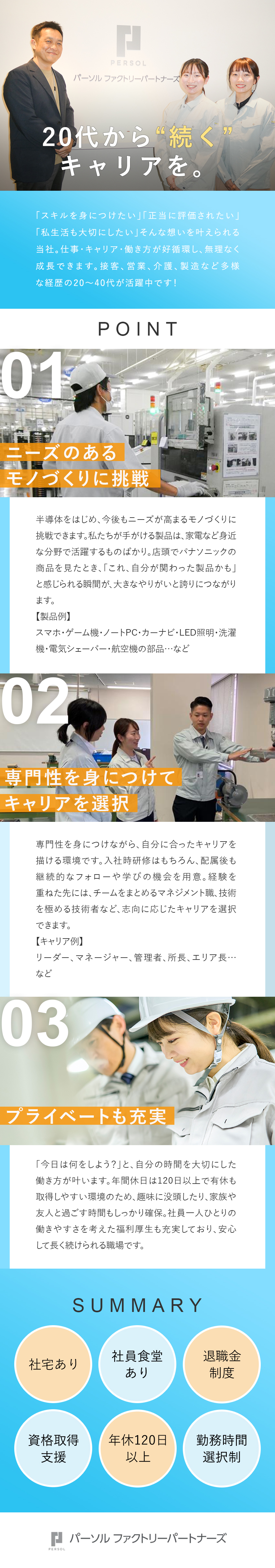 【松本】製造リーダー候補(ディスプレイ)◇未経験歓迎/パナソニック工場/日勤・夜勤いずれか/土日祝休