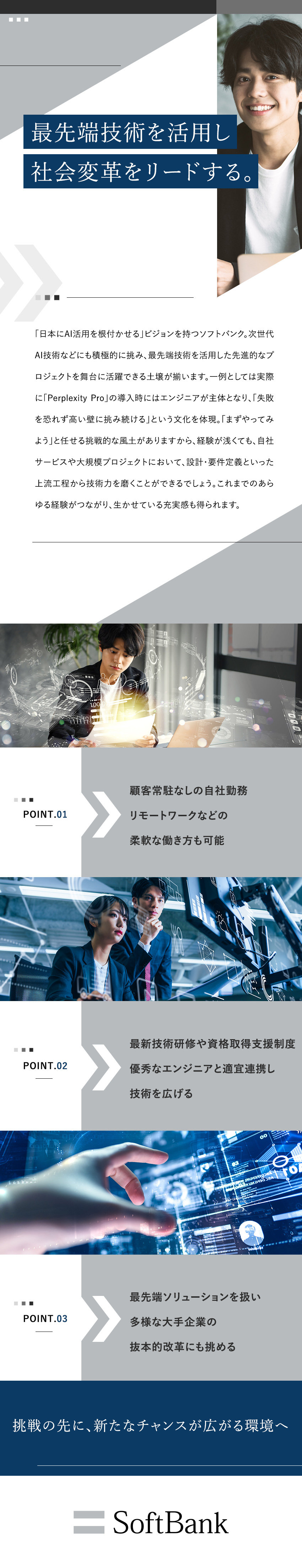 ・提案・設計・開発と全工程に関与するため、業務全体の本質的な改善活動に取り組める ・SB各社やメガクラウドベンダー、最先端のテクノロジーパートナーと連携し、大規模かつ社会的影響力の高い案件に参画できる