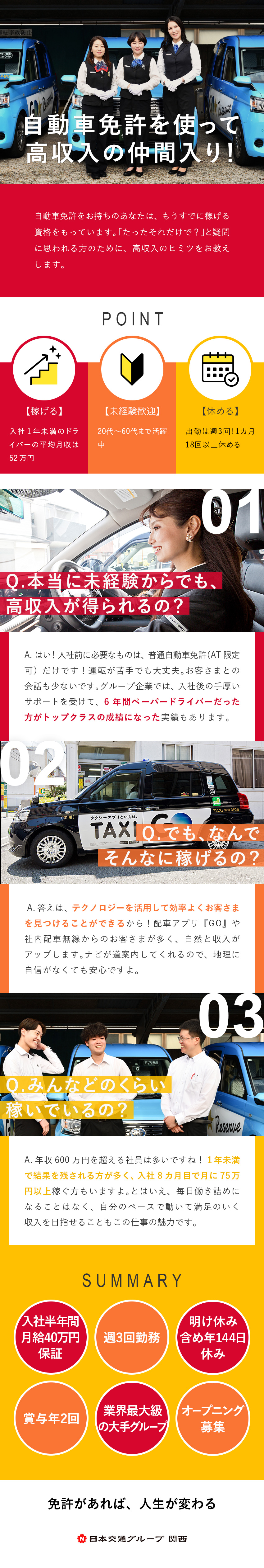 同社は2025年9月20日に、業界最大手の『日本交通グループ関西』へ加盟し、新たなスタートを切りました。今回の募集は、新たな環境で活躍してくれるオープニングスタッフの募集とのこと。安定感抜群の経営体制に加えて、しっかりと稼げる環境も整っています。