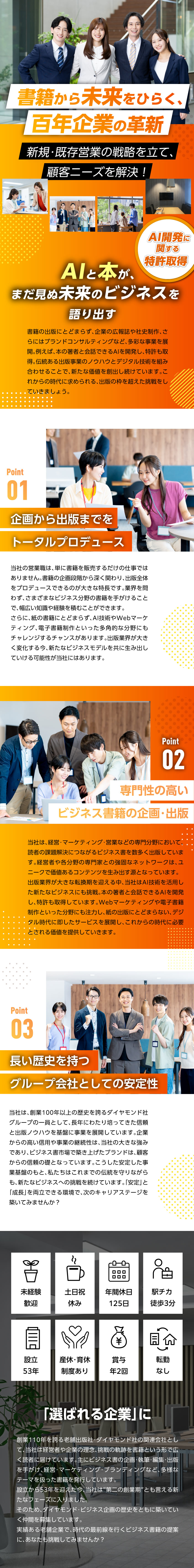 今回募集する営業職は、単に本を「売る」だけの役割ではなく、顧客の経営課題を丁寧にヒアリングし、書籍という形で最適なソリューションを提案する、コンサルティングに近いポジション。