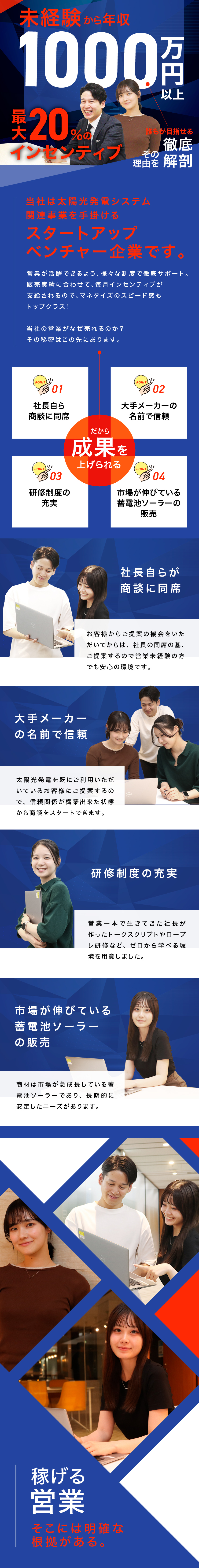 新規開拓の営業というスタイルは「とにかくハードワーク」「稼げる人はごく一握り」など、大変なイメージを持つ方もいらっしゃるかもしれませんが、これに当てはまらないのが「壱ソーラー株式会社」です。