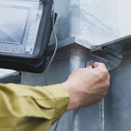 装置につながった聴診器のようなものを鉄骨にあてて検査を行います。検査箇所には、マーキングをいれます。