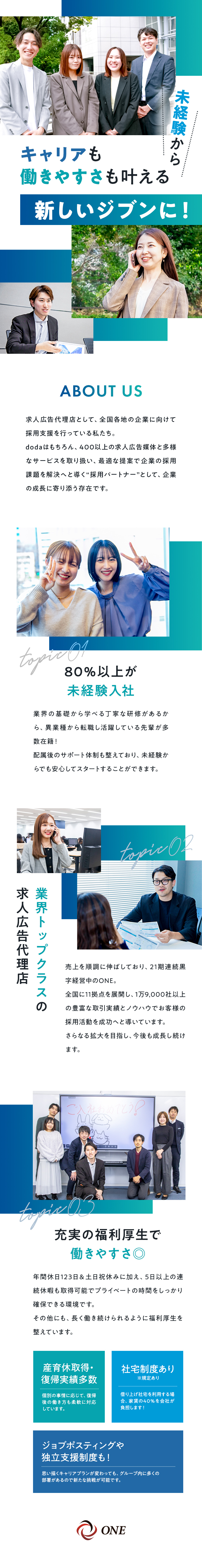 自分の描くキャリアを目指して自分らしく活躍したい方はもちろん、常に新しいことにもチャレンジを続けるONEでなら、安定した環境の中で経験を重ねていきながら成長していくことができるだろう。