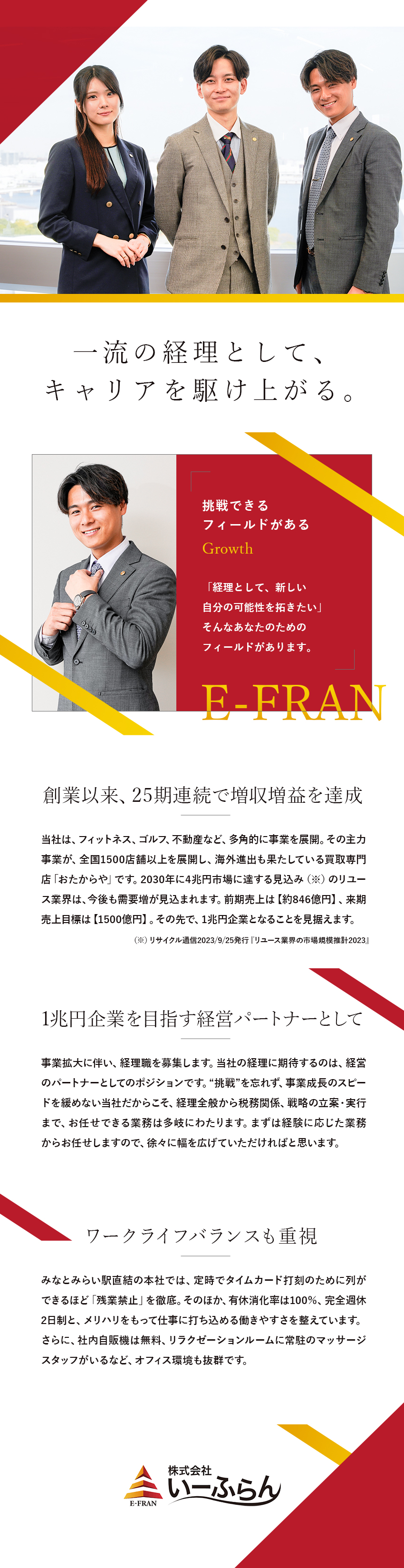 創業以来、25期連続成長の株式会社いーふらん。全国1500店舗以上を展開し、海外進出も果たしている買取専門店「おたからや」が主力事業です。