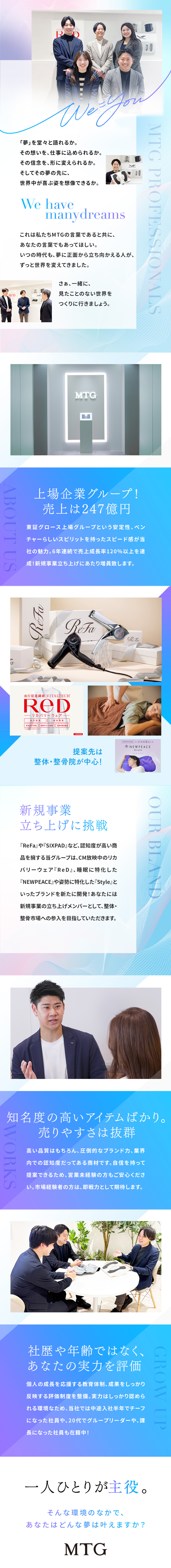 東証グロース上場企業、”MTG”グループ傘下であるMTGプロフェッショナル。当社はMTGが開発した『ReFa(リファ)』『SIXPAD』などの営業・販促を担う会社として誕生しました。6年連続で売上成長率120%以上を達成しており、拠点も続々拡大中。売上も247億円と急成長中。今回は新しくリラクゼーションマッサージサロン市場(整骨整体市場)に参入するための、立ち上げメンバーを募集することになりました。