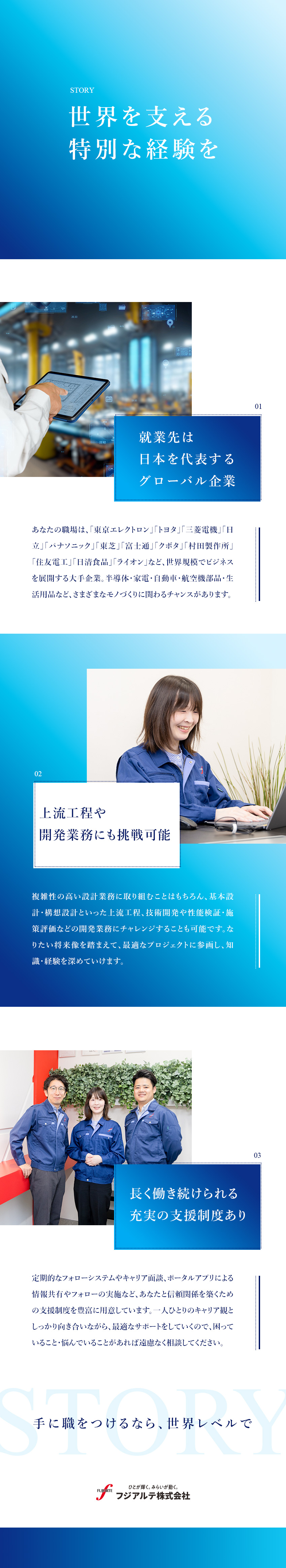 昨今、技術は目覚ましいスピードで進歩しています。技術者として生き抜くには、最先端技術に触れたり、幅広い業界を知ったりする機会が重要になってくるでしょう。その環境を取り揃えているのがフジアルテです。