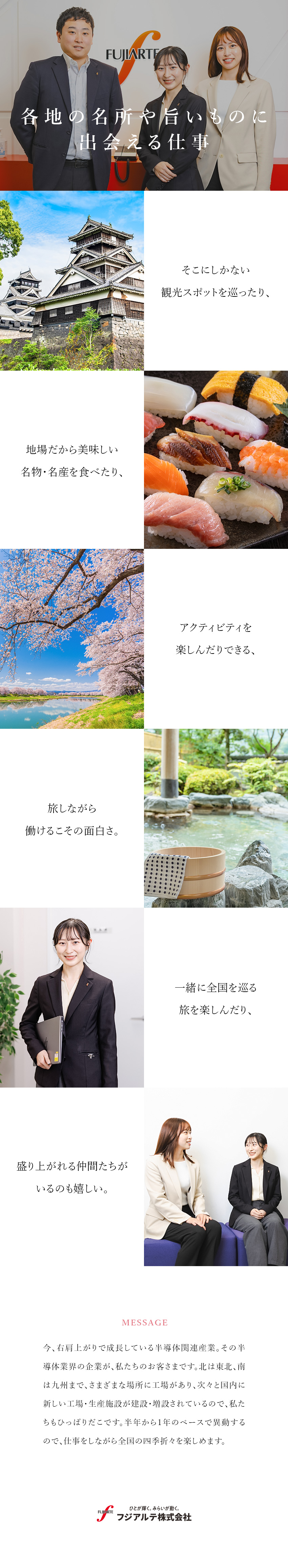半導体に関連する工場は、全国的に続々と建設されています。「一つの工場の立ち上げに携わったら、次は別の場所に移動する」という働き方で、心機一転!働く場所が変わっても仕事の基礎となる部分は同じなので、覚えたことがまったくのムダにならないことも嬉しいポイントです。