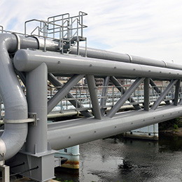 当社は、ライフラインを守る使命に誇りを持ち、水の重要性を深く理解しています。人間や生物にとって不可欠な水。それを輸送する管路は、地中に埋設されているため目に触れることは少なく、その中でも水管橋は特に重要視されます。水管橋は耐震設計上『重要度A』とされ、景観にアピールする鋼構造物として位置付けられます。当社は営業から施工までを自社で行っており、各部のスペシャリストがより良い製品のご提案、より良い品質の水管橋の制作を目指しております。