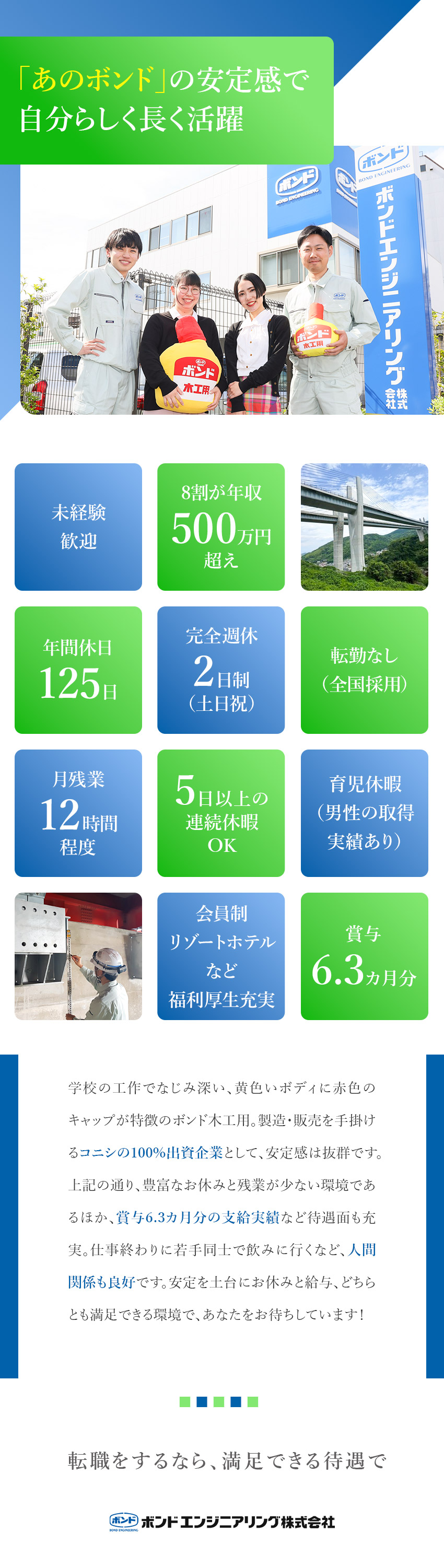安定と働きやすさです。グループとしての安定基盤はもちろん、この先も必要される補修・補強事業。お休みも豊富で、未経験でも年収500万円スタートなのは、ボンドエンジニアリングならではの魅力だと思います。