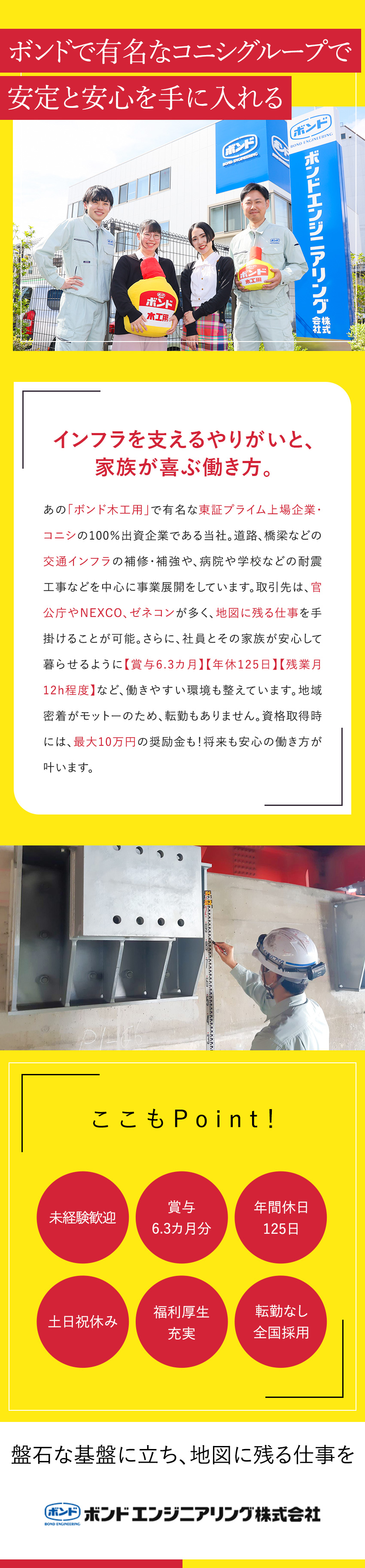 安定と働きやすさです。グループとしての安定基盤はもちろん、この先も必要される補修・補強事業。お休みも豊富で、未経験でも年収500万円スタートなのは、ボンドエンジニアリングならではの魅力だと思います。