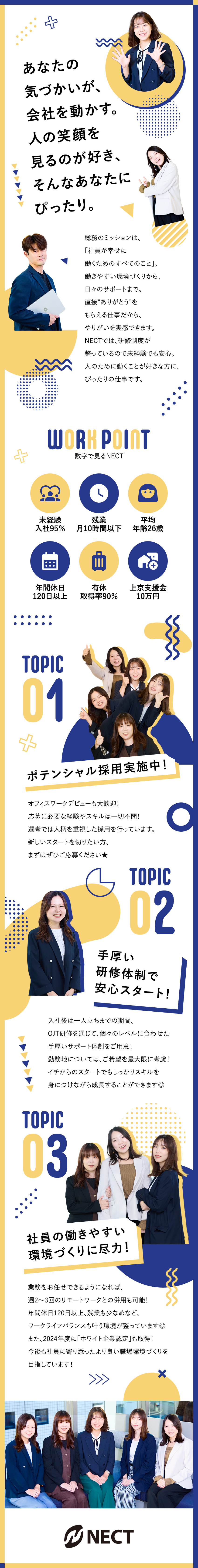 私自身も未経験からスタートしました。はじめは不安もありましたが、NECTは研修制度も充実しているので、イチからでも安心して始めることができました!スキルを身につけて自分らしく成長できます!