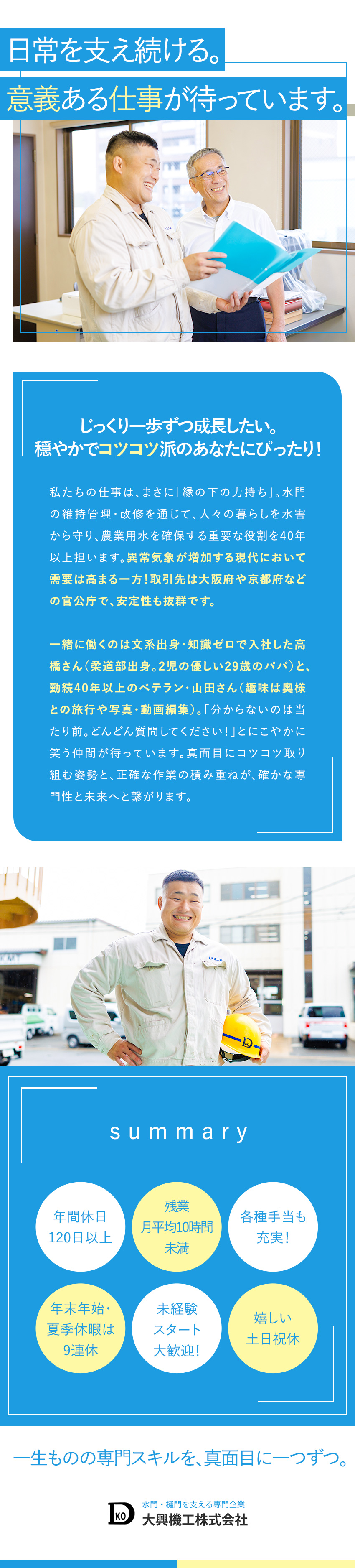 専門性が身につく水門設備の技術職/残業時間10H/未経験歓迎