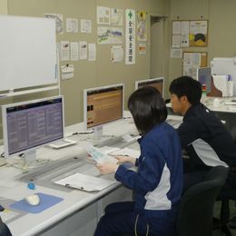中央監視室での様子。機器の運転状況、処理された水の状態の確認など、全体を細かく確認しています。