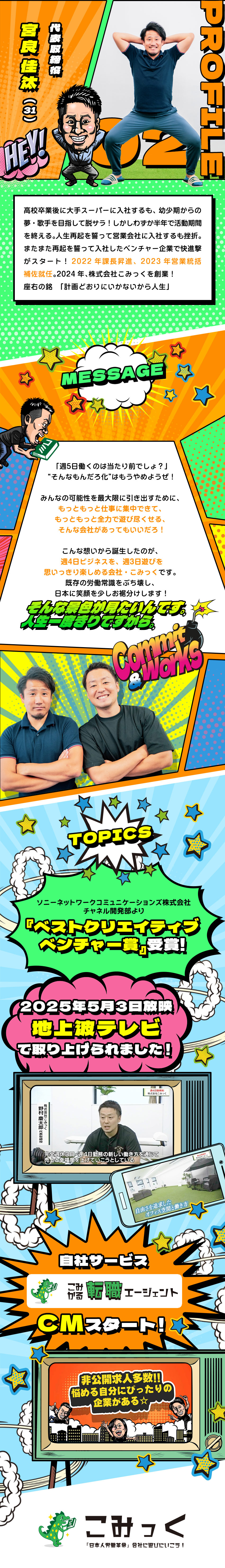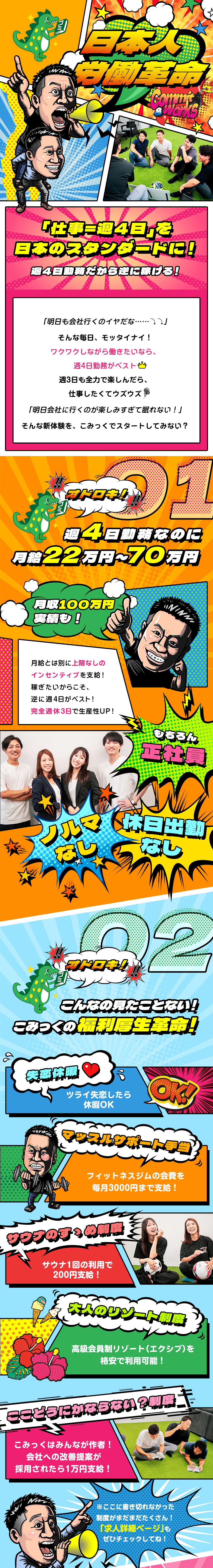 ★「『仕事=週4日』を日本のスタンダードに!」を目指す新時代のコンセプトから始まるカンパニーです!会社には遊びに行くものです。
