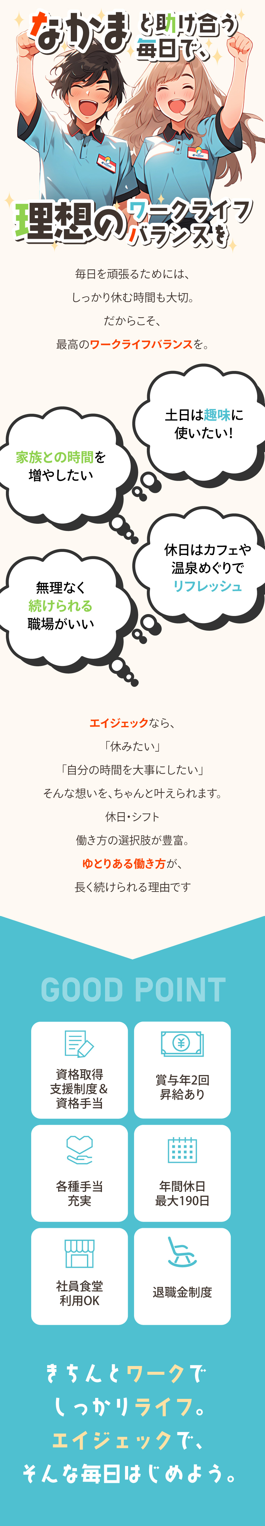 安定した環境と待遇、そしてフォロー体制をご用意することで、長く続けられる土台を構築しています。
