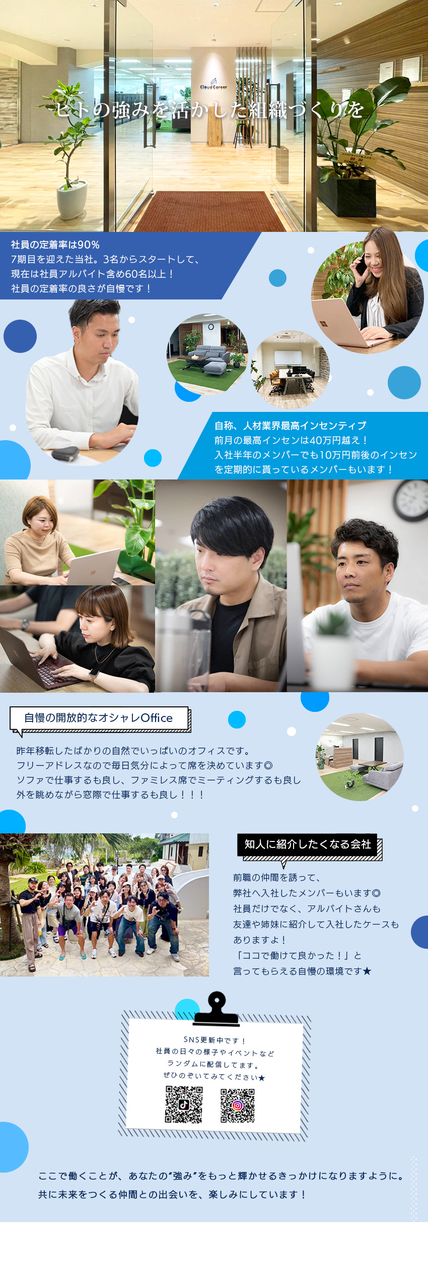 弊社では一人ひとりの《強み》はとことん生かして、《弱み》は誰かに任せる!そんな組織づくりを意識しています。だからこそ強みは伝染していき大きな力になり、弱みは皆でカバーし合う助け合いの文化がとても染みついています。