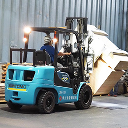 4tフォーク(クランプフォーク、カウンターフォーク)を操作し、合板の倉庫内運搬を行います。