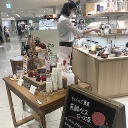 百貨店内に店舗を構える「enherb」は、落ち着いた雰囲気の中でハーブティーの香りが漂う癒しの空間。取材で訪れた店舗では、スタッフがお客様と丁寧に会話しながら、一人ひとりに合った商品を提案していました。