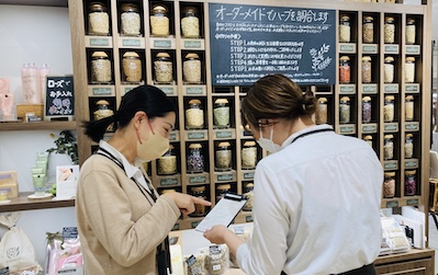 百貨店内に店舗を構える「enherb」は、落ち着いた雰囲気の中でハーブティーの香りが漂う癒しの空間。取材で訪れた店舗では、スタッフがお客様と丁寧に会話しながら、一人ひとりに合った商品を提案していました。