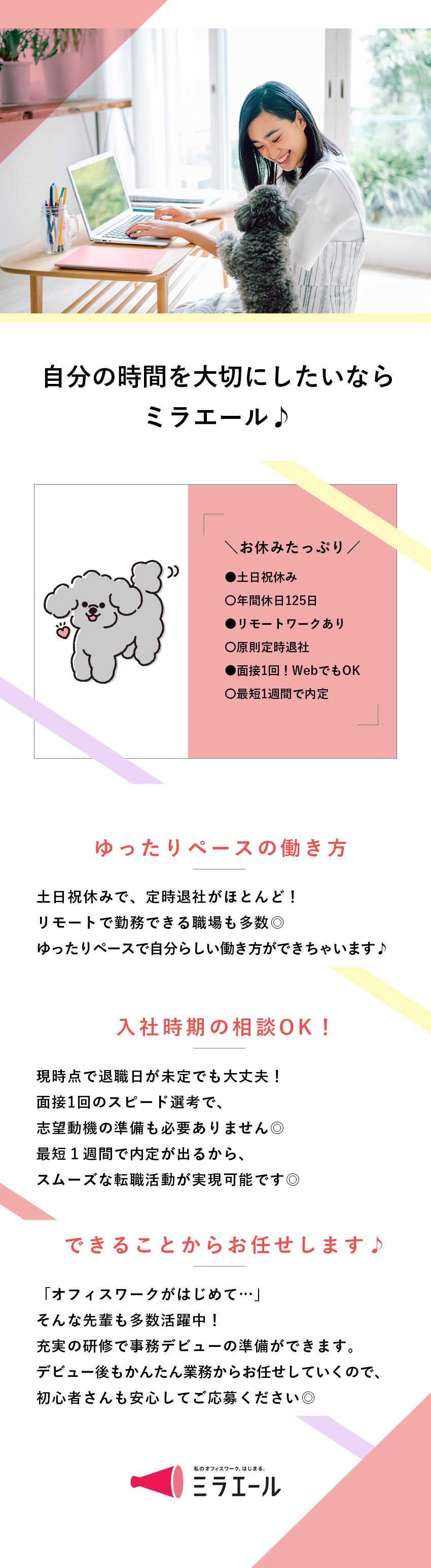 “面接というより面談”という言葉に後押しされてミラエールに応募。その言葉通り、リラックスした雰囲気で相談に乗っていただけてありがたかったです。自分の希望や適性に合わせた就業先を、一緒に考えて具体的に提案してくれました!その中の一社で未経験から事務デビュー!スムーズにキャリアチェンジできました◎」
