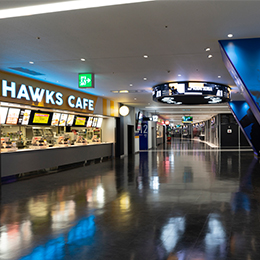 黒と白を基調としたデザインに全面刷新した3階コンコース。