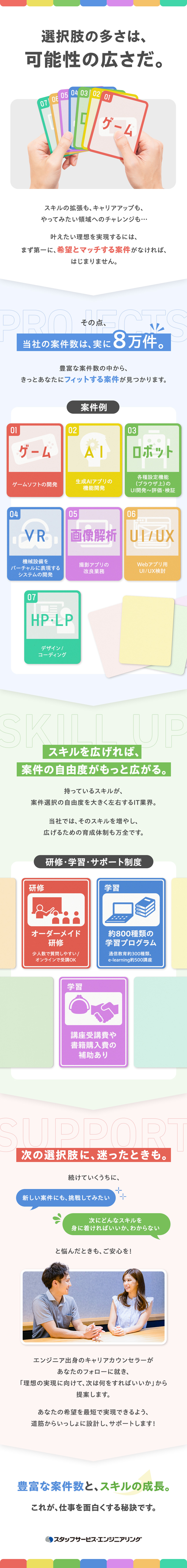 80,000件以上のプロジェクトの中には上流工程のプロジェクトも多数あるので、エンジニア経験者もきっと満足できるでしょう。もちろん、これまでに挑戦したことのない分野に携わることも可能!エンジニアとしてどんどんスキルを磨ける環境です。
