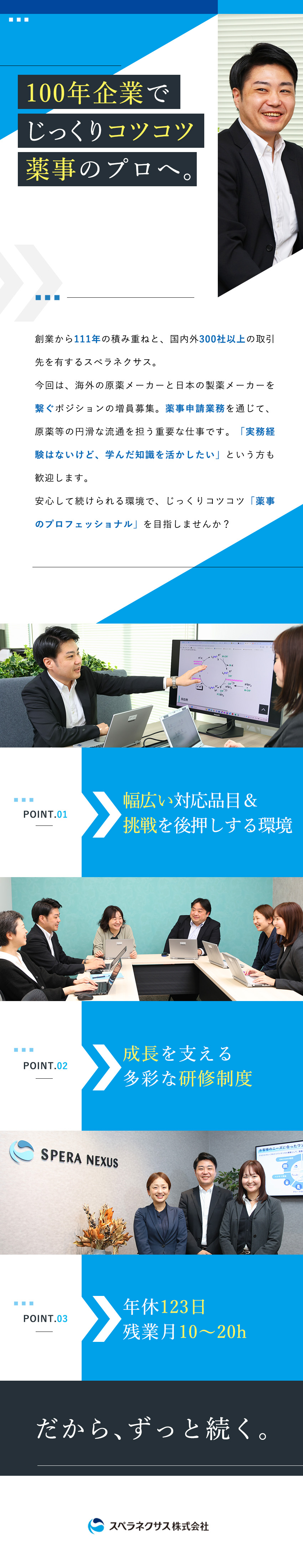 さらに、GMP教育をはじめ、メーカー主催のWebセミナーなど知識を深める機会も豊富にあり、専門的な知識やスキルを高めながら、成長を実感できるのがポイント。幅広い業務を、時間をかけて学べる体制が整っています。