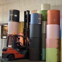 巻き取った紙はフォークリフトで運んでいきます。慎重に扱っていきましょう!