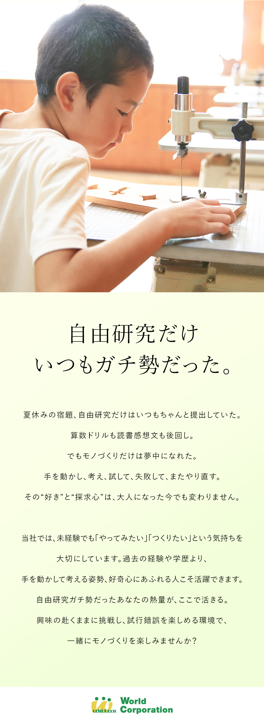前職では製造現場の仕事で毎日同じルーチンワークでした。定年までこの仕事はしたくないと思い、転職でワールドコーポレーションへ。自分で考えたり、アイデアを活かすワークスタイルなので刺激的な毎日です!
