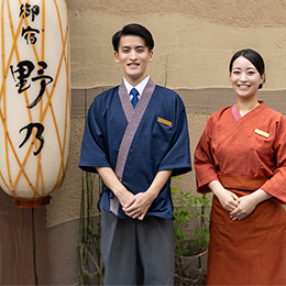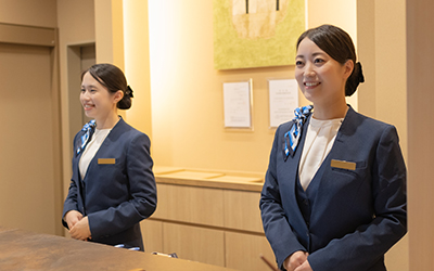 フロント・レストランでの接客業務からスタート。先輩の指導を受けながら、少しずつ経験を積んでください。