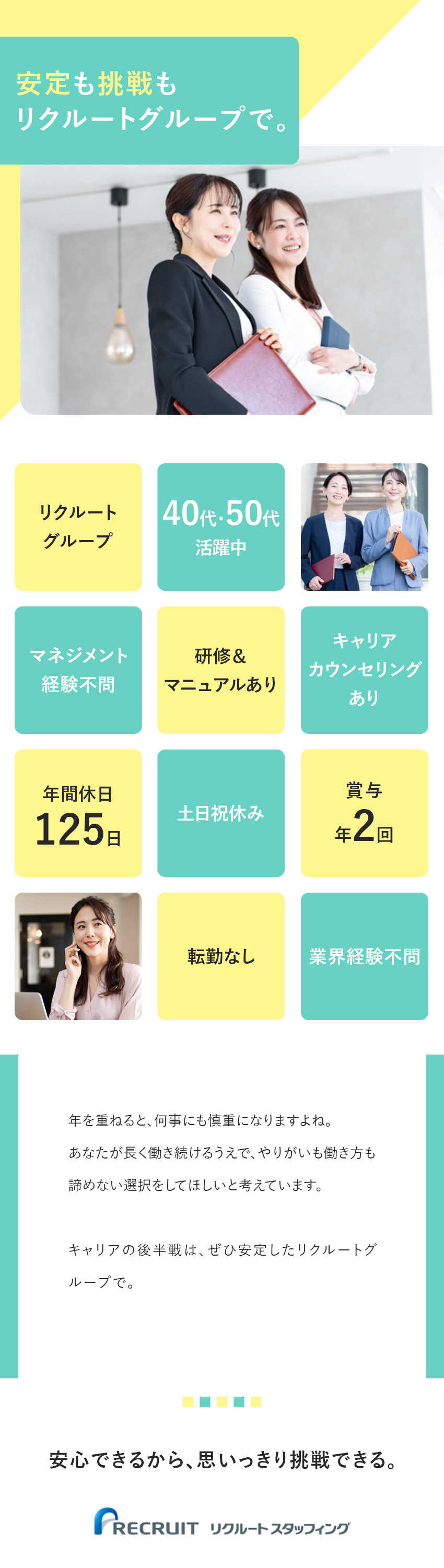 リクルートスタッフィングのBPO部は、さまざまなバックグランドや社会人経験を持つ社員が多数活躍しています。なかでも社会人経験歴が長い方、ブランク復帰をした方などからは「定年まで働き続けたい」という声が多く、最後の転職先として選ばれているのが特徴です。