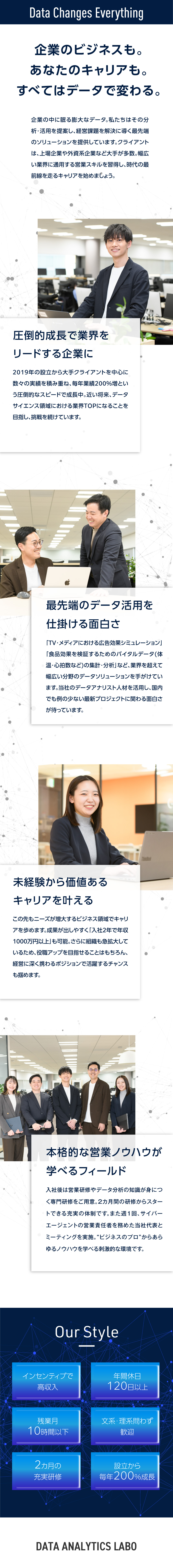 同社が見据えているのは、“国内トップのデータサイエンス企業”になること。その実現に向け、営業部門の強化にも力を入れています。近い将来、営業社員を現在の数倍規模にまで増員するため、今入社する社員には早くからメンバーをまとめる役職やポストに就くチャンスがあふれているのだとか。さらにその先として、経営陣に加わるキャリアも目指すことできます。