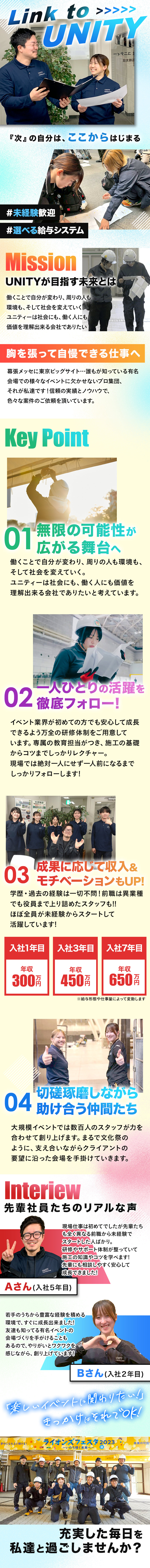 もともとは私も未経験でした。でも、周りの先輩や同僚にフォローしてもらって、着実に成長できました。仲間たちで助け合い、チームでイベント会場を完成させるため、日々やりがいを感じられます。