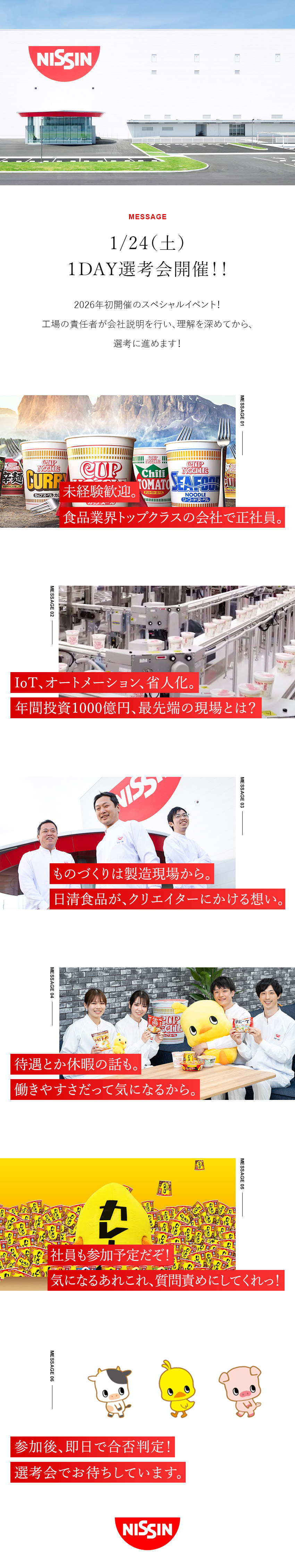 そんな日清食品では現在、カップヌードルなどの製造を支える技術者を募集しています。アルバイト・パートではありません、社員としての採用です。食品業界は初めて…という方も大歓迎。画面の中で見るのではなく、日清食品の技術者として活躍してみませんか?