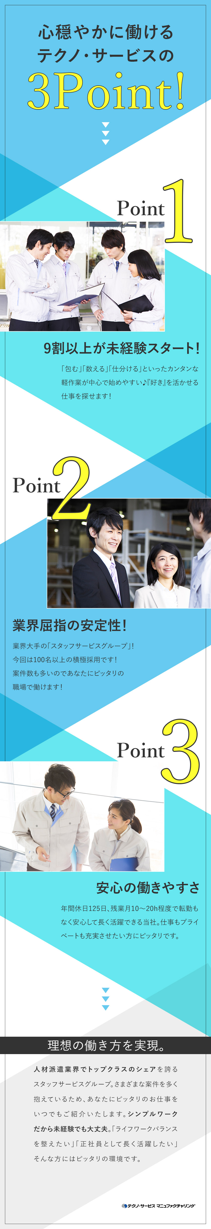 そんなモットーを掲げるスタッフサービスグループ。業界トップクラスのシェアを誇る同グループの中でも、製造・軽作業に特化した派遣サービスを展開しているのが「テクノ・サービス」です。