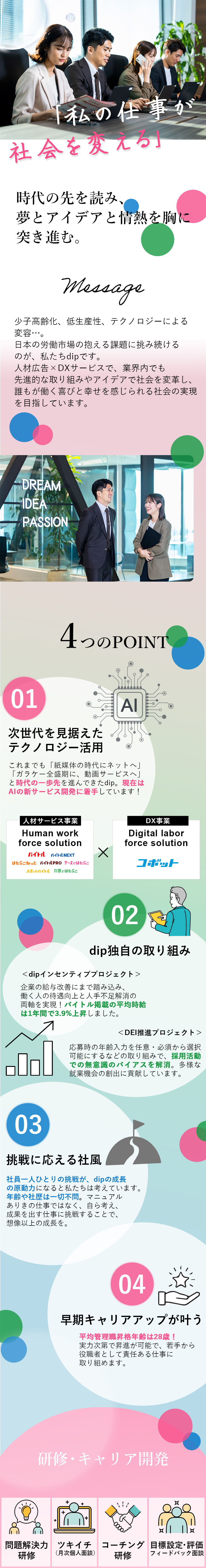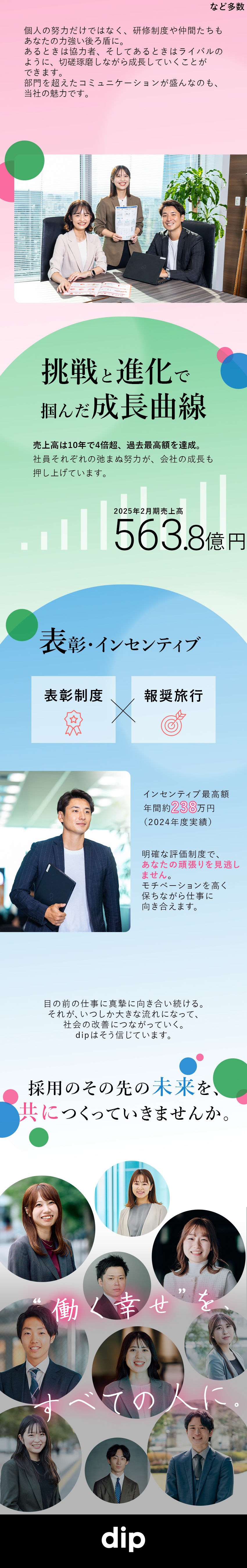 ディップでは、 多様な個性を持つ社員一人ひとりの力を磨き、最大限 に発揮できる制度・環境をつくり、その幸福度を高められる取り組みをしています。