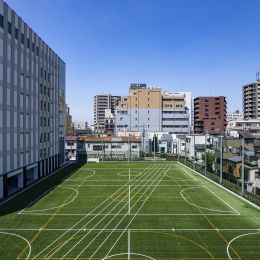 校内の人工芝のグラウンド。休み時間になると、生徒たちがスポーツをして過ごします。