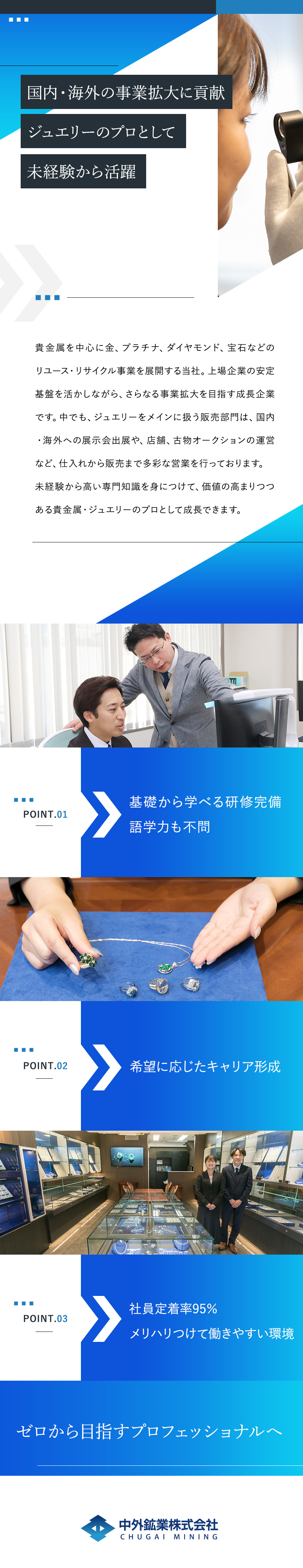金やジュエリーなど、貴金属にまつわる多彩なビジネスを展開する同社。未経験からでも、さまざまな領域で挑戦が可能なため、業務を通して多彩なスキルが身につく環境が魅力です。アイデアを活かした仕入れや、高価格帯のお取引、海外でのイベント、経営者・専門業者との商談など、未経験からでもスケールの大きな環境で経験を積んでいけます。日々の業務を通して、成長を実感できるでしょう!