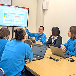 自然に笑顔が生まれる社内会議。役職や立場に関係なく、意見を出し合える風通しの良さがあります。